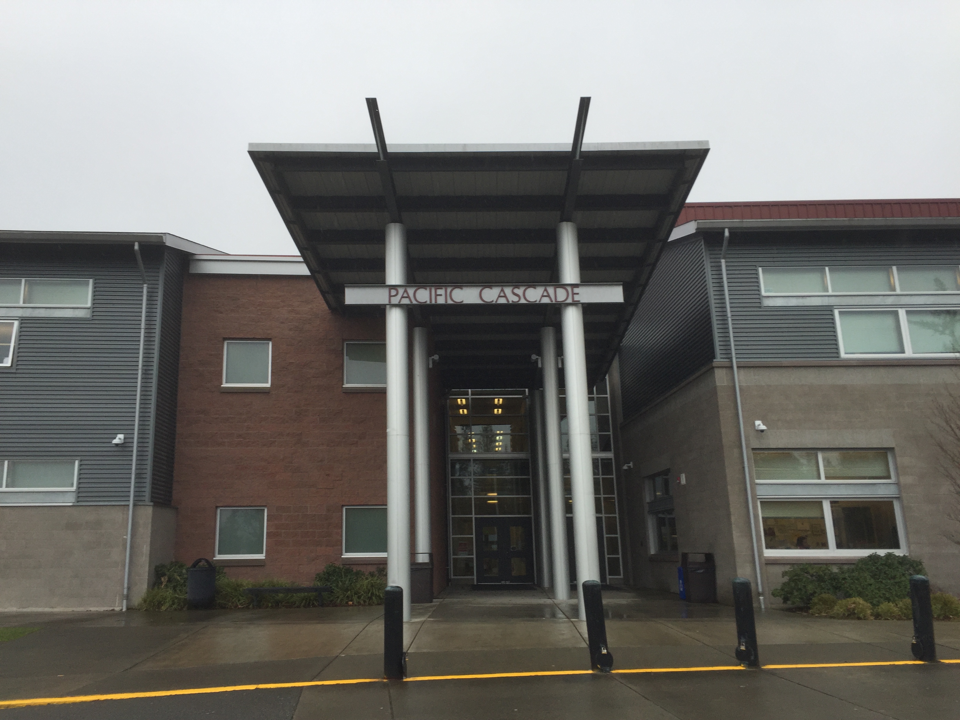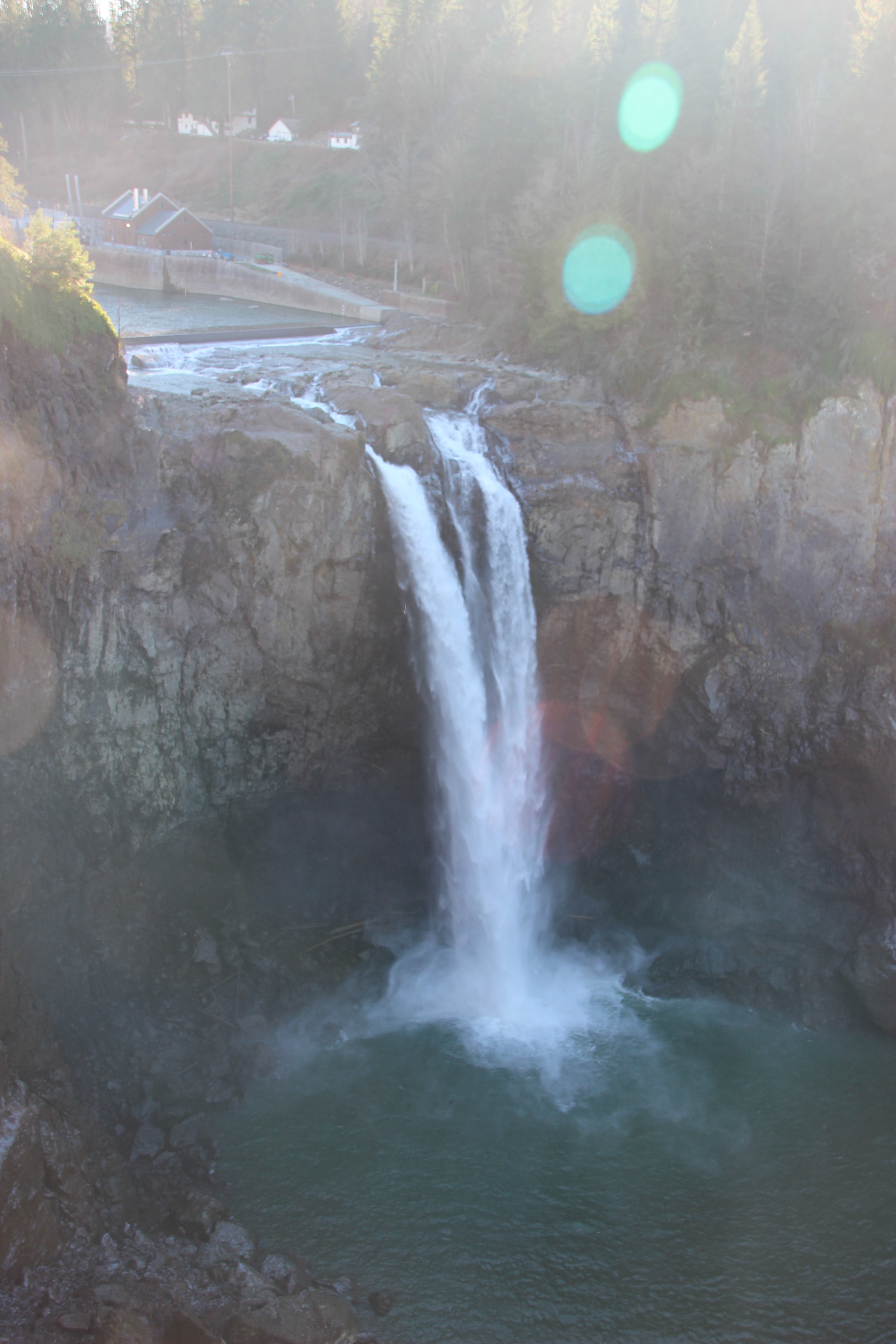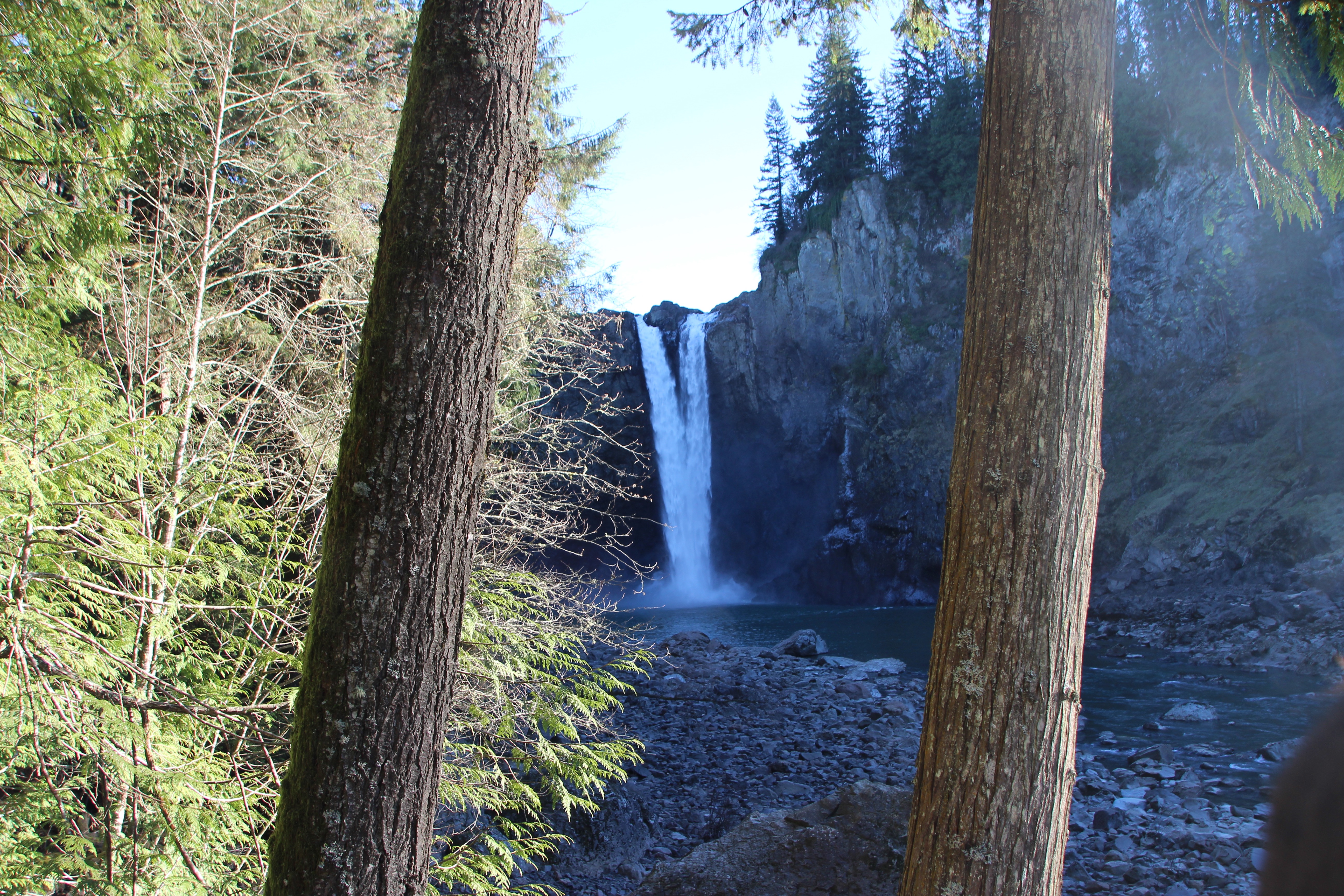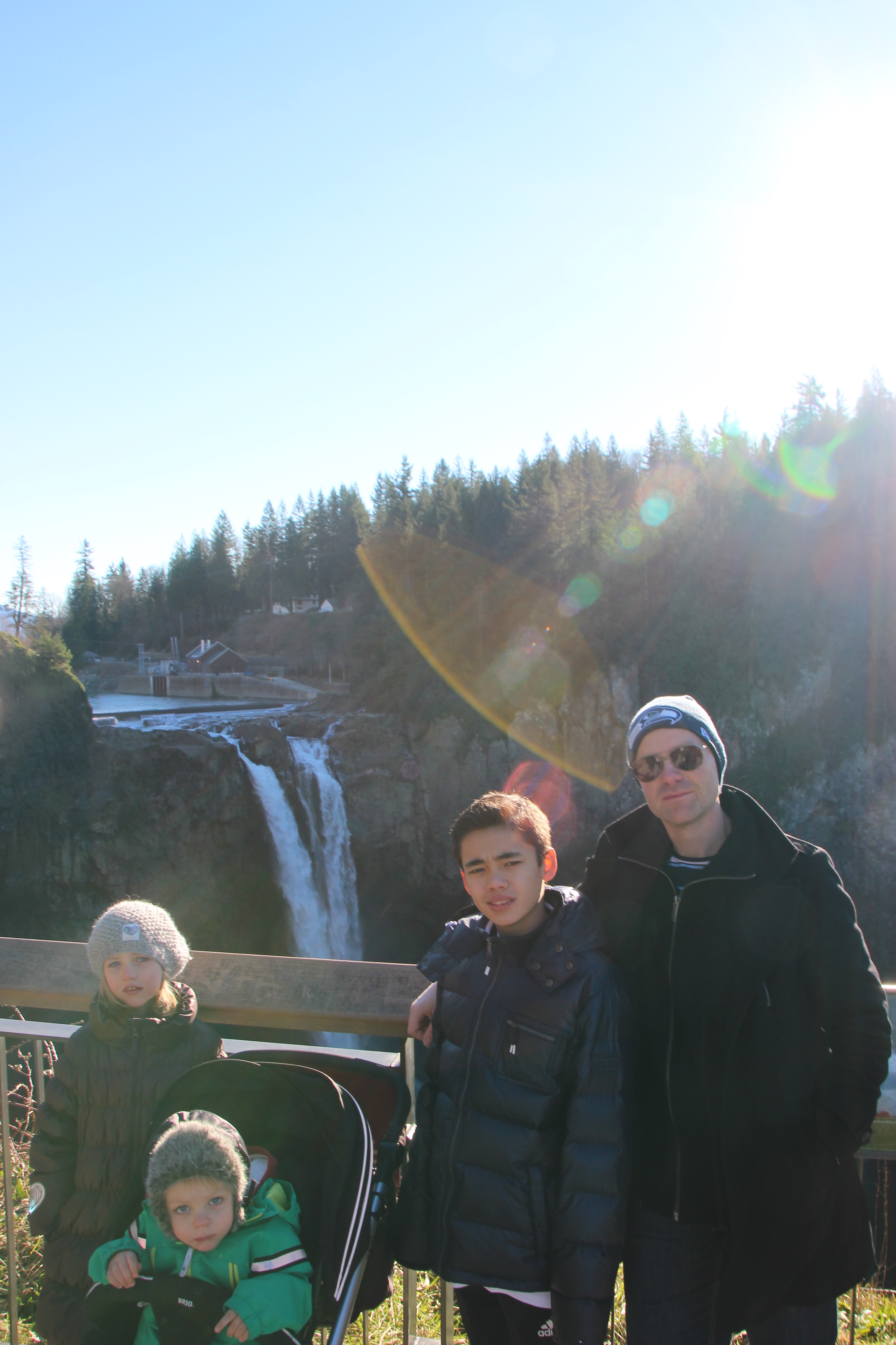 Efter en kort natts sömn så vaknade vi till ännu en solig och klar dag, de är ganska sällsynta här så det gäller att ta vara på dem! Vi hade sedan tidigare bestämt att vi skulle åka till Snoqualmie falls, det är ett stort vattenfall som ligger bara 20-25 min bilväg ifrån vårt hus. Det är en av Washington states största sevärdheter, det besöks av mer än 1,5 miljon personer varje år. Vattenfallet är 270 feet högt vilket är ungefär 82 meter. Bara vägen dit var en upplevelse i sig, stora snöklädda berg ligger runt om oss och de är så otroligt branta, ser liksom ut som gigantiska väggar som bara reser sig upp från ingenstans. Det känns som om vi snarare är i alperna och kör eller något sådant, här är några bilder som jag knäppte av längs med vägen: