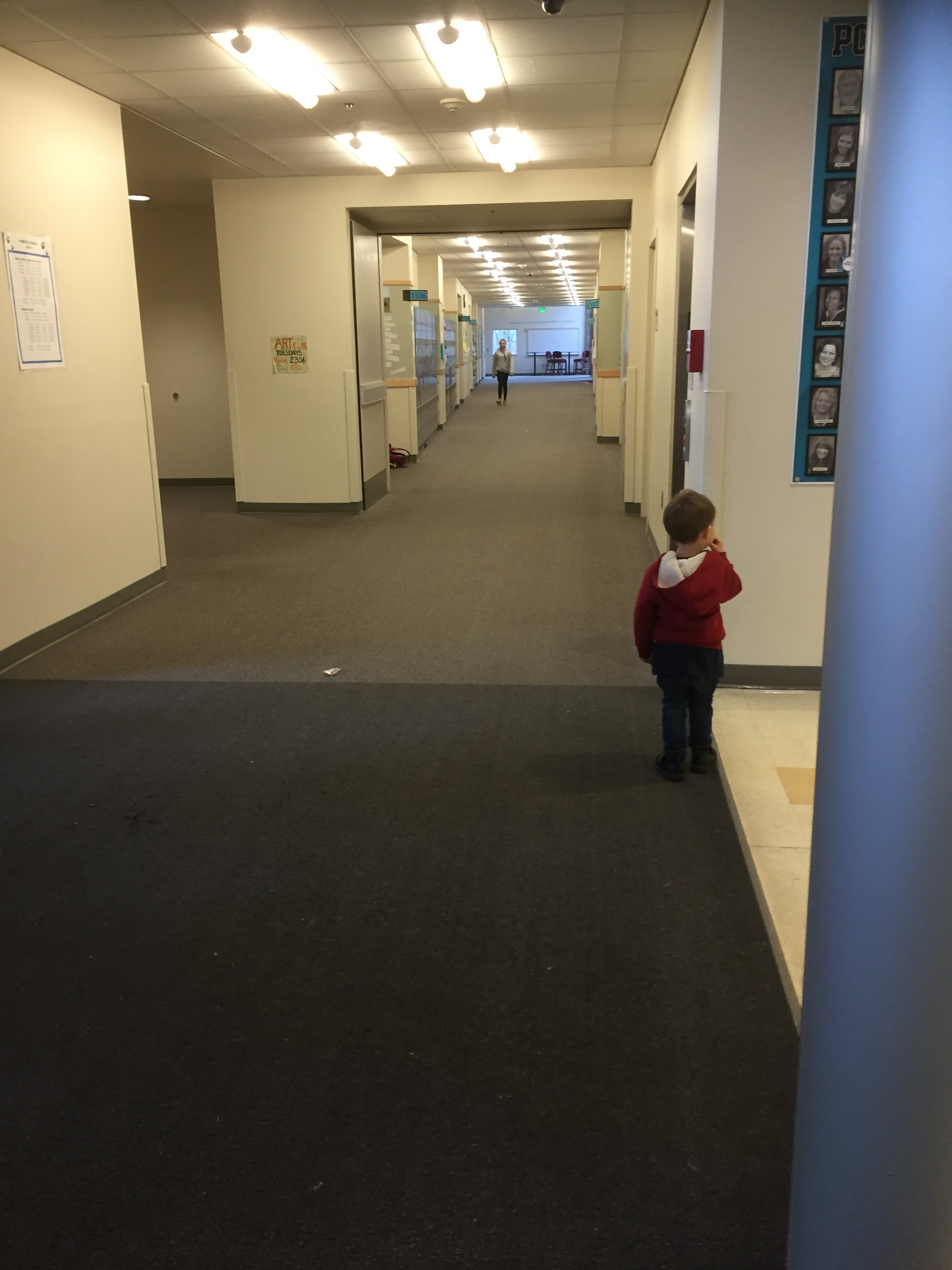 Idag åkte jag och hämtade Hampus när han slutade skolan för att visa honom vart bussarna går och vilken buss han ska ta osv. Inte helt lätt kan jag säga, även här är det ingen lång väntetid. När skolan ringer ut kl 14.05 så står alla bussarna uppradade utanför skolan och det var säkert 20 stycken skolbussar. Jag och Hampus hann inte mer än ut och titta på bussarna och börja leta efter vart bussnumrena stod osv förrän alla bussarna åkte iväg på en given signal. En lång karavan av bussar lämnade skolan och enligt schemat så lämnar bussen av Hampus hemma på busshållsplatsen kl 14.19 varje dag, ska bli spännande och se om han kommer med bussen imorgon. Jag får nog räkna med att hämta honom några gånger så här början innan han har lärt sig hur allt fungerar ordentligt. Kan ju också tillägga att skolan ser ut som på alla amerikanska filmer, stora långa korridorer med skåp längs väggarna. Korridorerna är helt tomma på folk fram tills klockan ringer då fylls de på nolltid av alla eleverna som rusar fram och tillbaka för att hinna i tid till nästa lektion, ett myller av ungar överallt. Jag hade Sam med mig idag och han sprang lite fram och tillbaka i korridoren medans vi väntade på att Hampus skulle sluta, då gick en personal förbi och sa till mig att det är nog bäst att du plockar upp honom innan klockan ringer för de kommer springa omkull honom annars och det hade hon nog alldeles rätt i. Jag skickar med en bild på korridoren före och efter klockringningen: